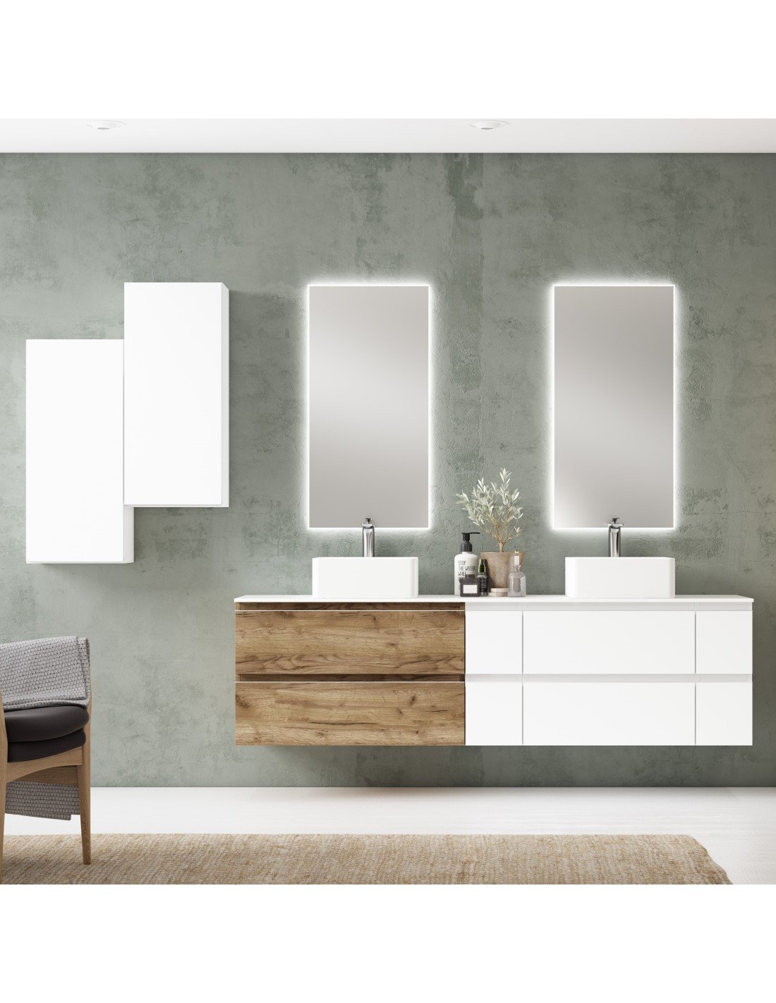Una serie modular que nos permite adaptarnos a cada espacio en el baño con diferentes opciones y combinando ambos colores. Podemos optar por una encimera blanco mate en solid surface o bien madera en acabado Avellana.